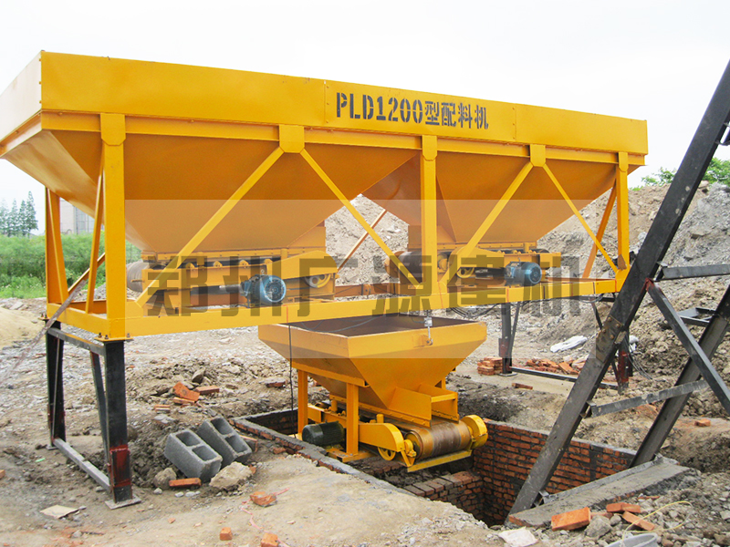 2、骨料系统:①PLD800两仓配料机一台 ②2.2m³的储料仓2个 ③容积0.8m³混合称量1套 ④1000kg的拉力传感器3个